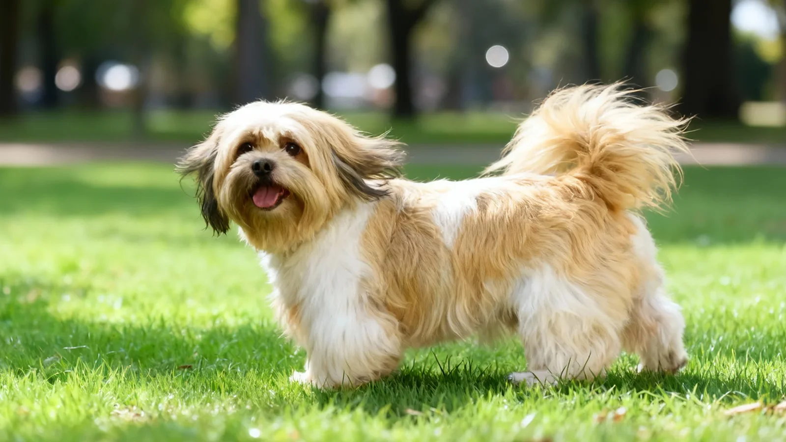 拉萨犬属于小型犬,体格紧凑结实,背线相对平直,四肢比例协调,整体给人“小而稳”的感觉。头部略长,口吻中等,眼睛为深色椭圆形,表情警觉而略带一点高冷。耳朵下垂,被毛覆盖丰富,尾巴高举并自然卷曲在背上,走动时尾毛随之摆动。
